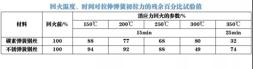 消應力回火對拉伸彈簧的初拉力是有影響的,回火溫度低,保溫時間短,保留的初拉力較大,反之初拉力保留得小。下圖列出瞭(le)回火溫度、時間對拉伸彈簧初拉力的殘(cán)餘百分比試驗值。(如下圖):